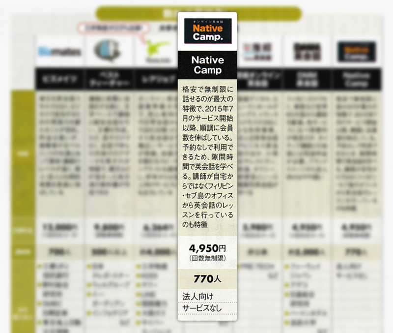 2016-12-08 雑誌「週刊ダイヤモンド」に掲載されました【2016年12月5日】 ネイティブキャンプ特集 お知らせ Native Camp.が雑誌「週刊ダイヤモンド」に掲載されました! 特集「商社の英語」既存VSオンライン仁義なき戦い