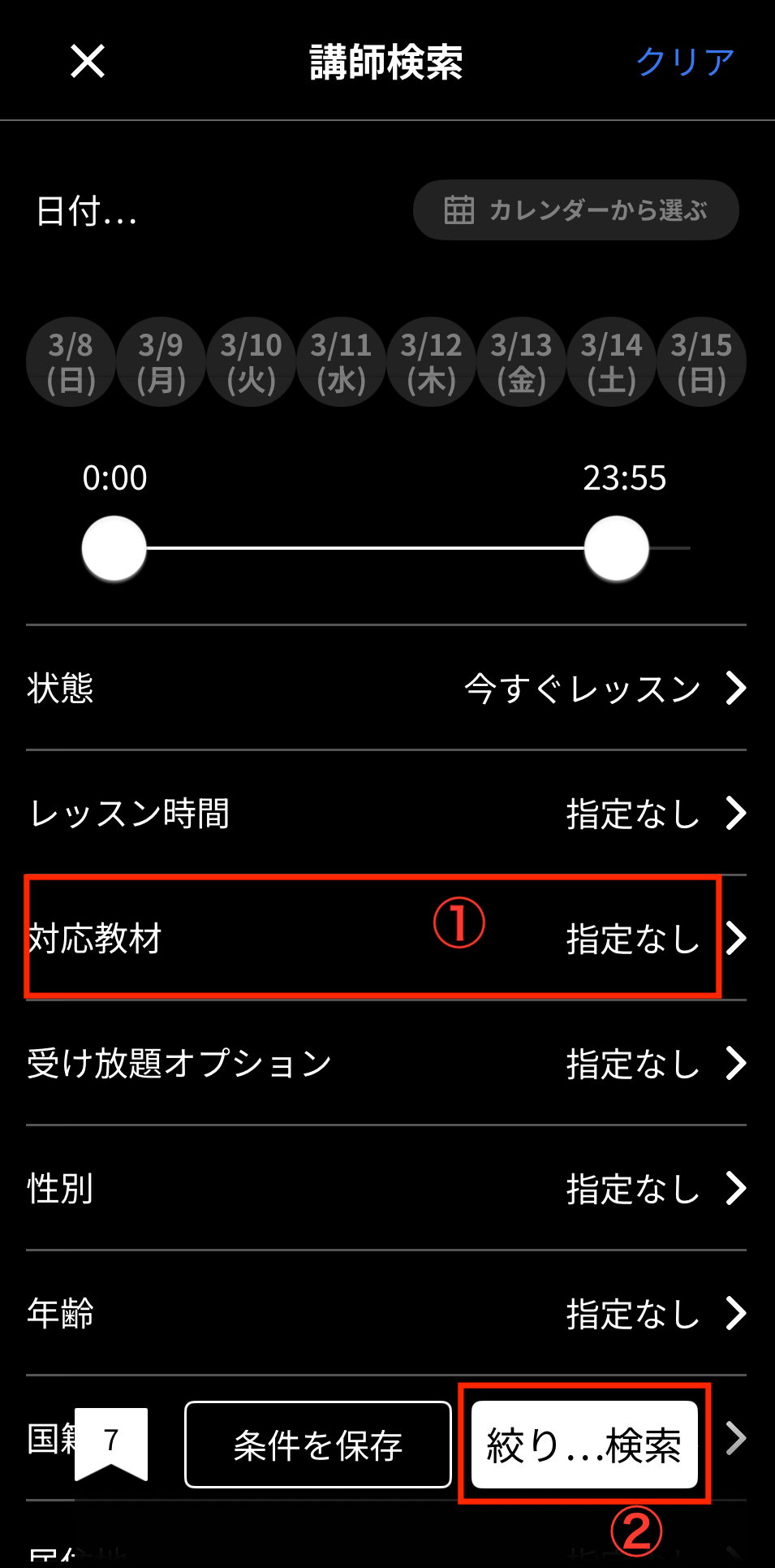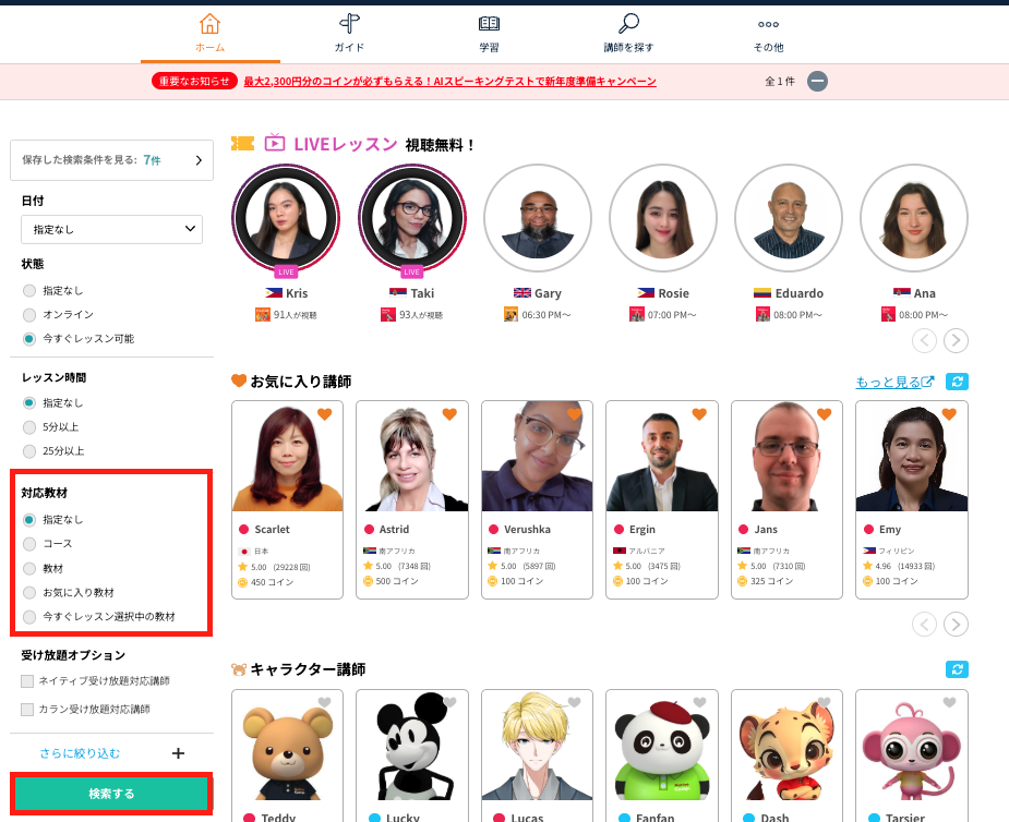 講師検索で教材を指定すると、対応している講師だけを絞り込めます。