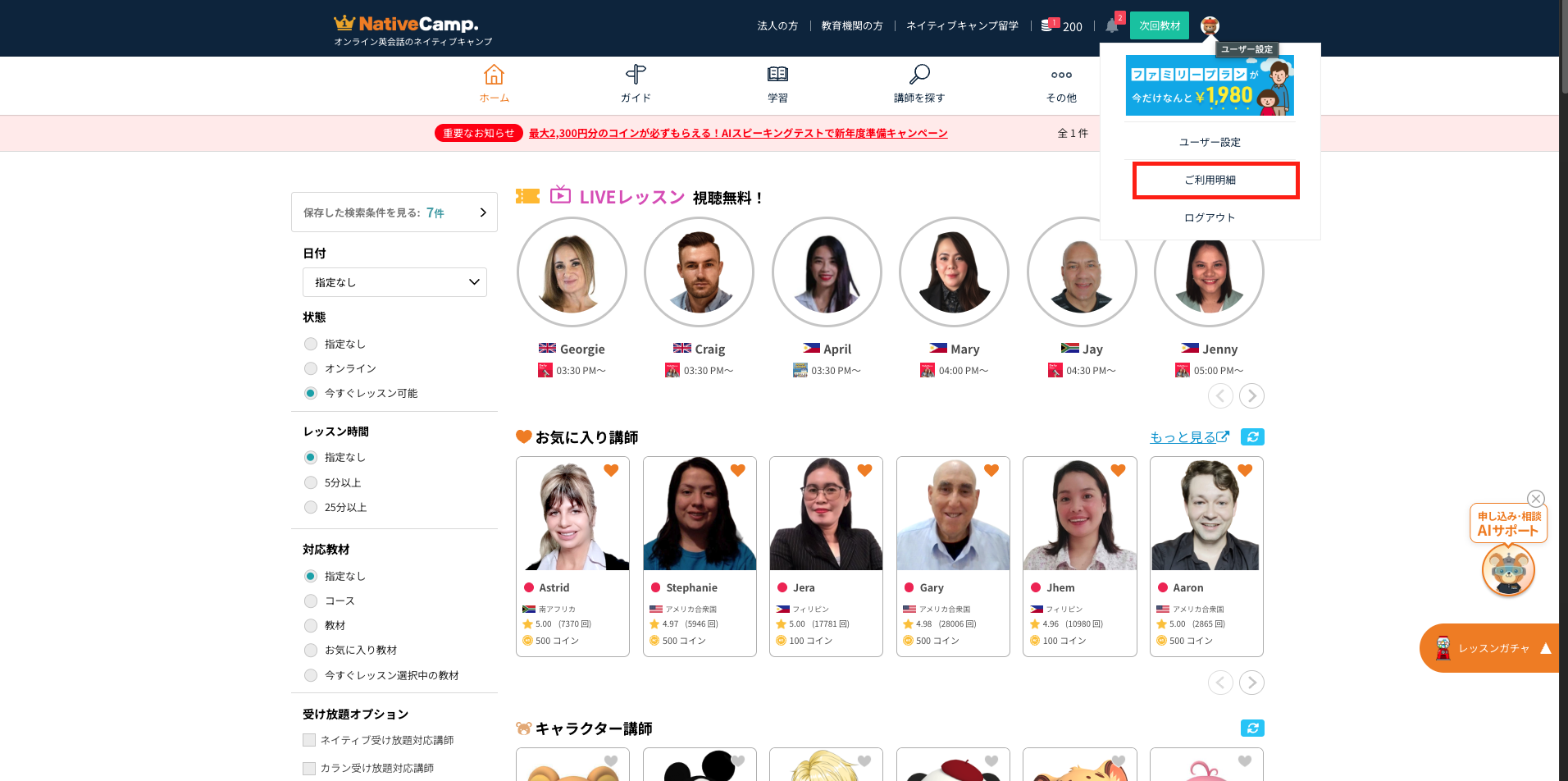 特別優待プランの利用期間を過ぎているか、「今すぐレッスン」の上限回数に達しているため、ご利用いただけません。