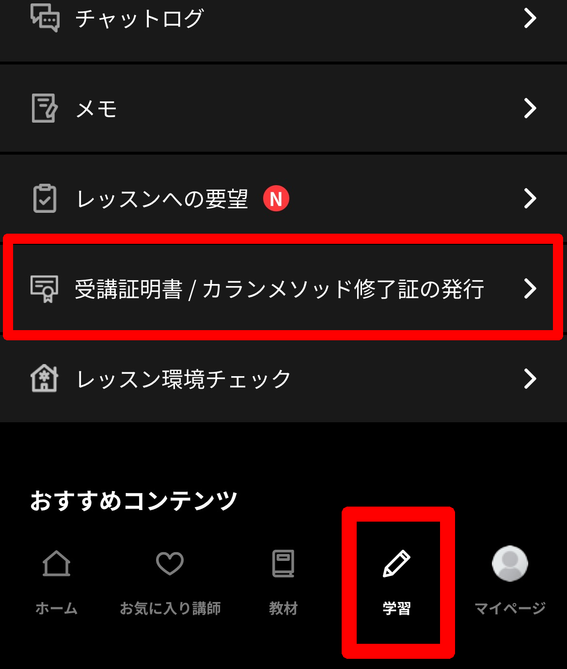 表示された項目の中から「受講証明書 / カラン修了証の発行」を選択します。