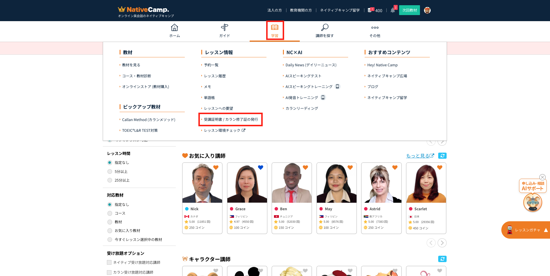 受講証明書発行ページへの直接リンク https://nativecamp.net/certificate