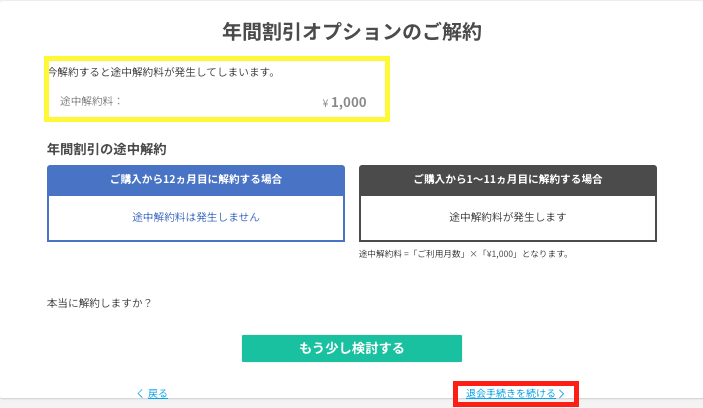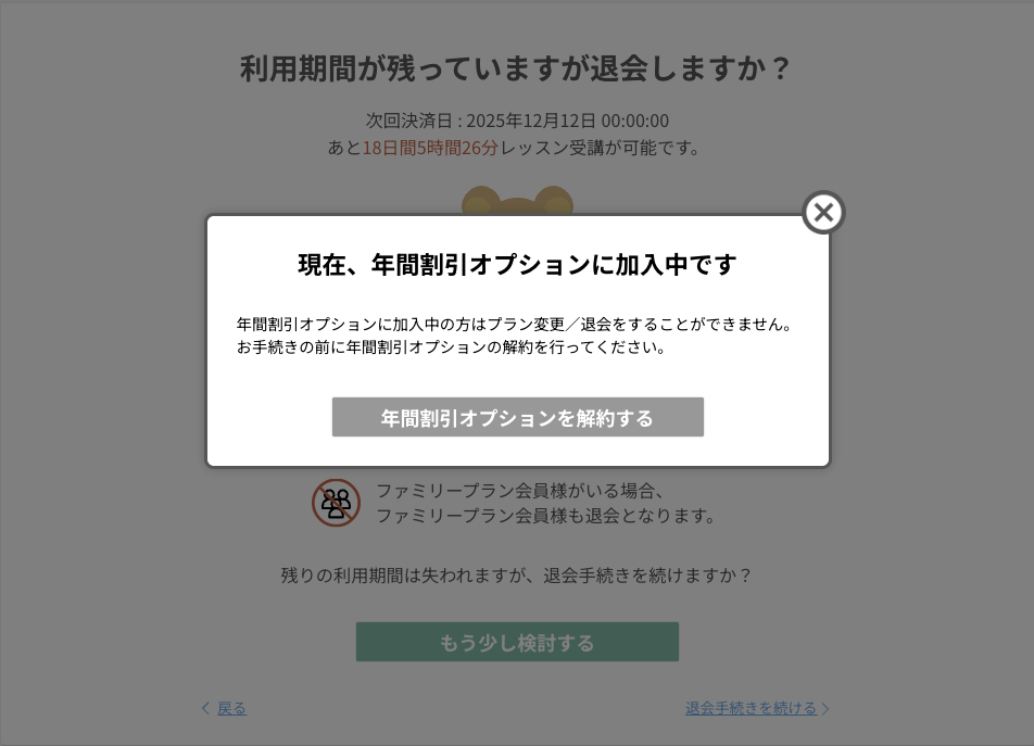 退会手続き中に年割引オプションの解約画面に遷移しますが、年割引オプションの解約のみではプレミアムプランの退会手続きは完了しません。