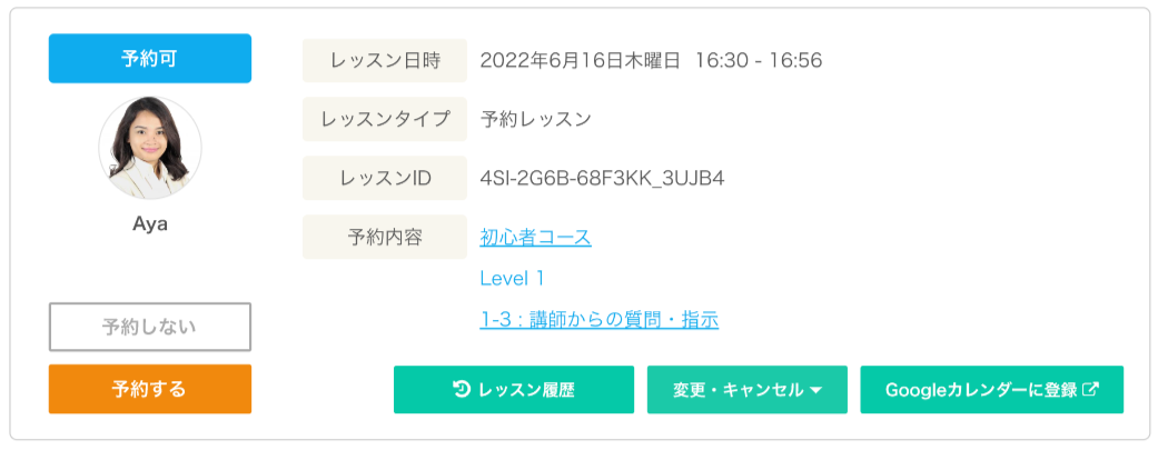 お詫びとして代替講師(無料)による予約レッスンを手配いたしました。