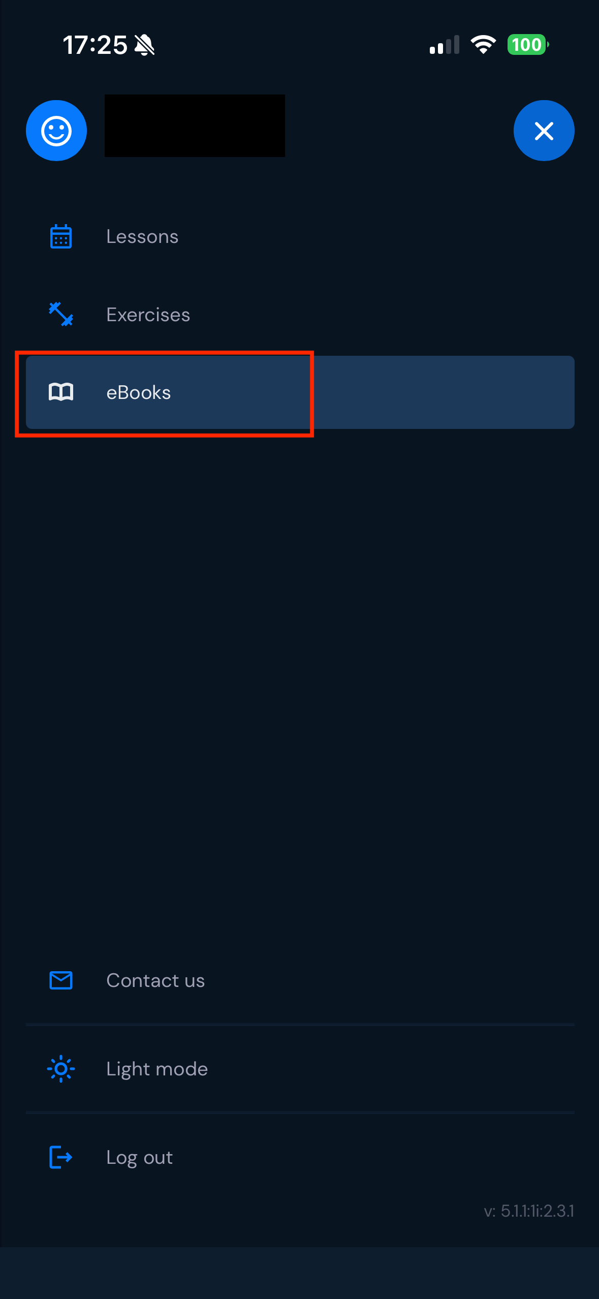 3. アプリ内の右上にあるメニューから「eBooks」をタップします。