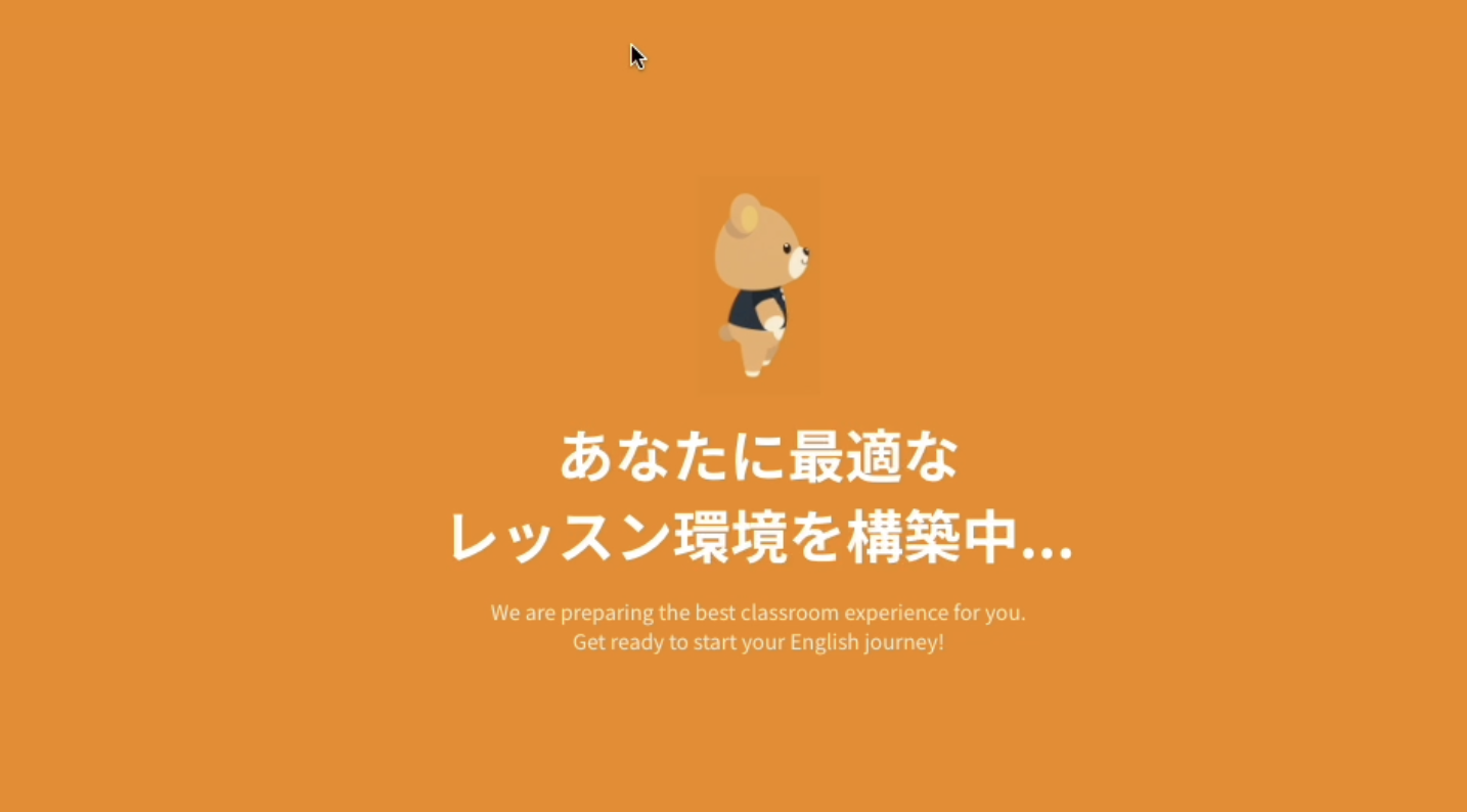 いいえ、不具合ではありません。「今すぐレッスン」で講師と接続されるまでの間に表示される、準備中画面です。 くまのキャラクターが表示されたあとにレッスン画面へ切り替わり、音声・映像が接続された状態でレッスンが始まる仕様です。