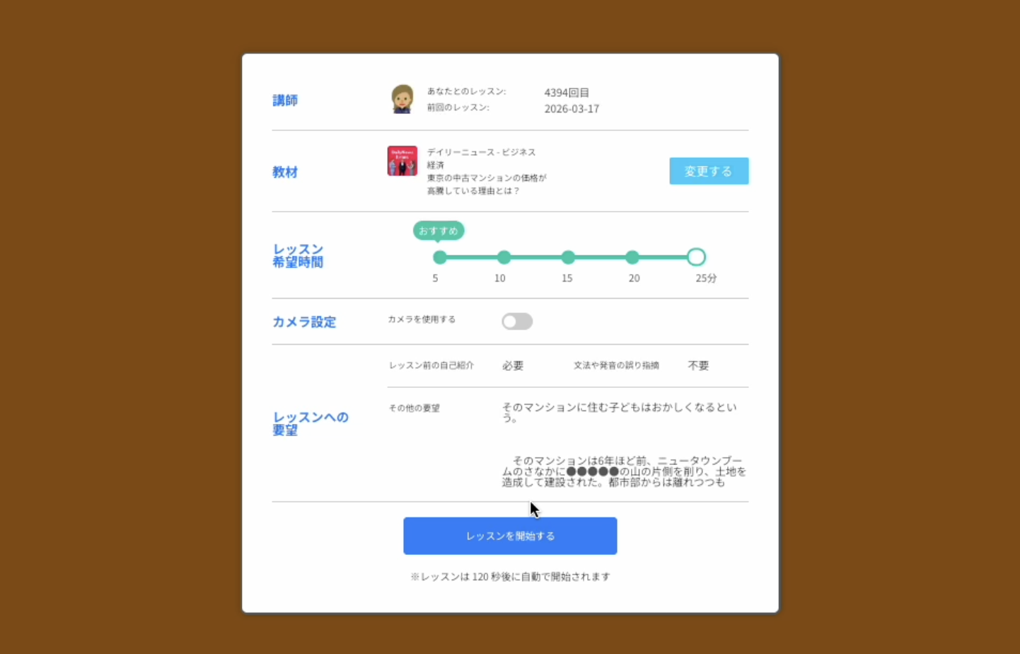 この画面は、よりスムーズにレッスンを開始できるよう実施したアップデートにより表示されます。