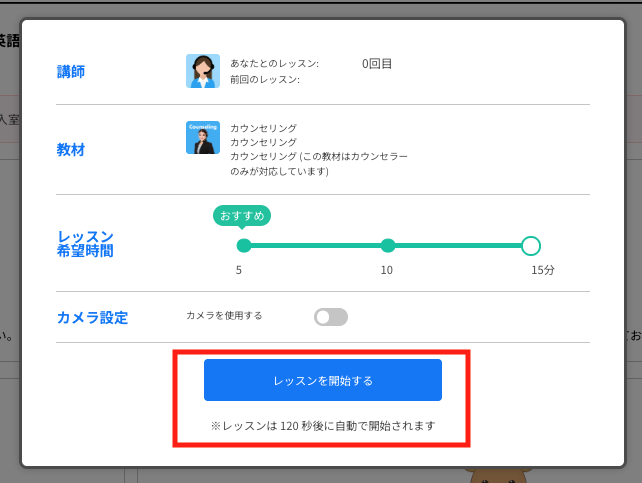 「レッスンを開始する」ボタンを押すか、120秒(約2分)経過すると中央のモーダルは自動で消えます。