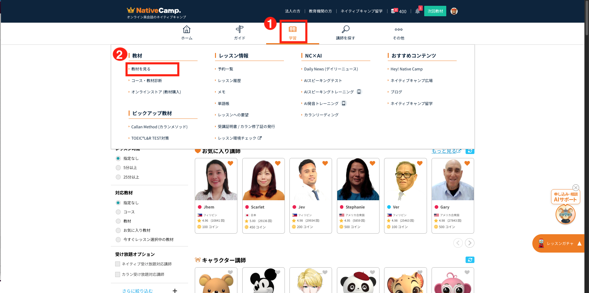 1.ログイン後、上部メニューから「学習」から「教材を見る」をクリック
