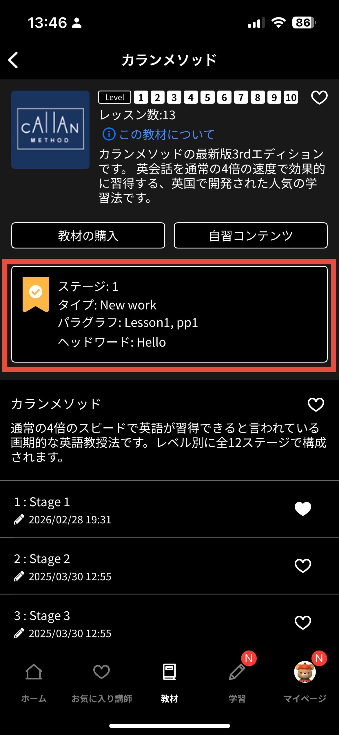 1.ログイン後、「教材」タブをタップ