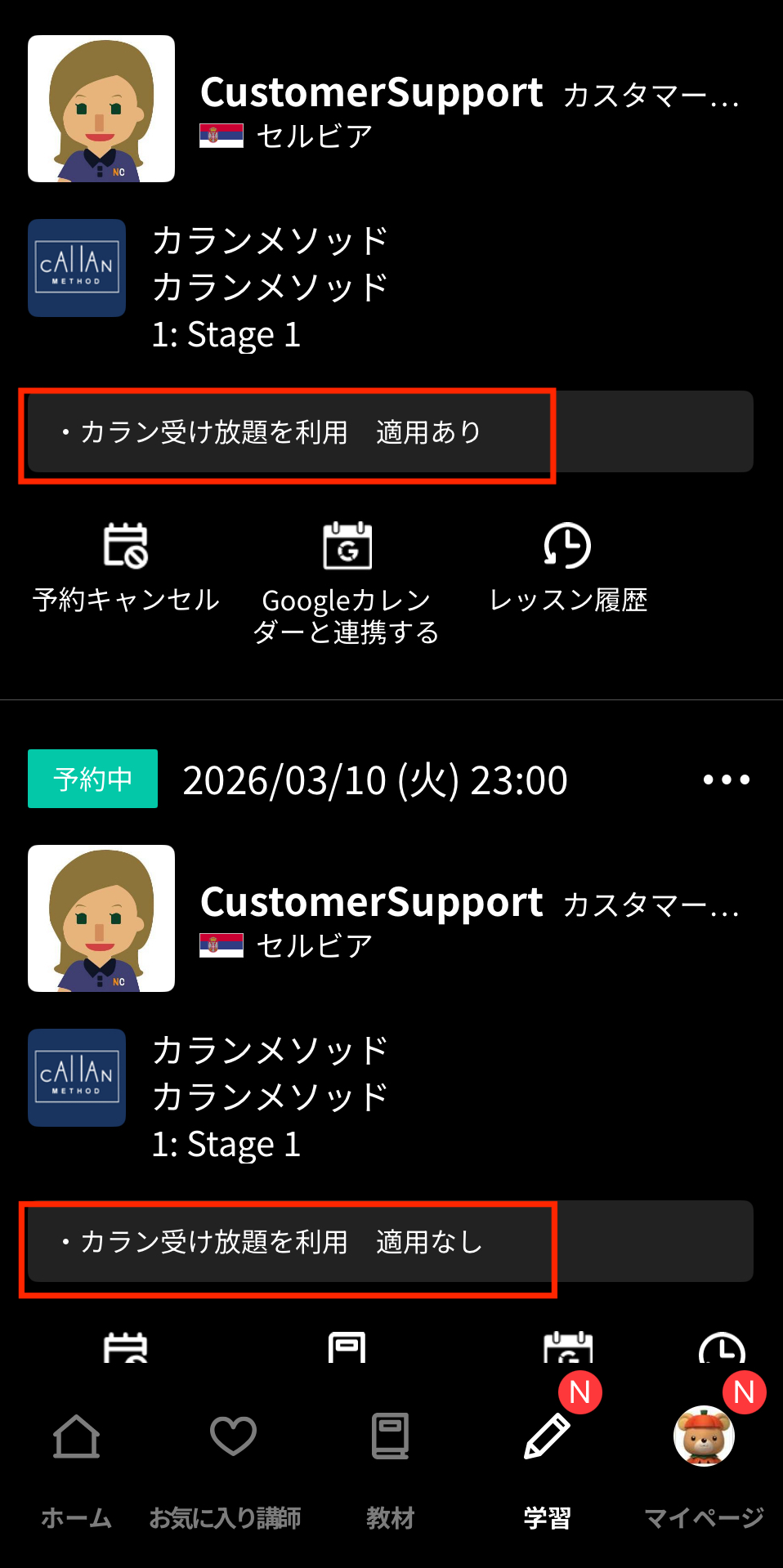 そのため、レッスン受講終了前の状態で次の予約を取得された場合、カラン受け放題オプションが適用されず、コインが必要となります。
