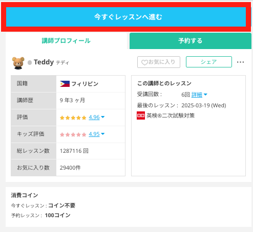 「今すぐレッスン」はコイン消費なしで回数無制限受講できます。表示されているコイン数は関係ありません。