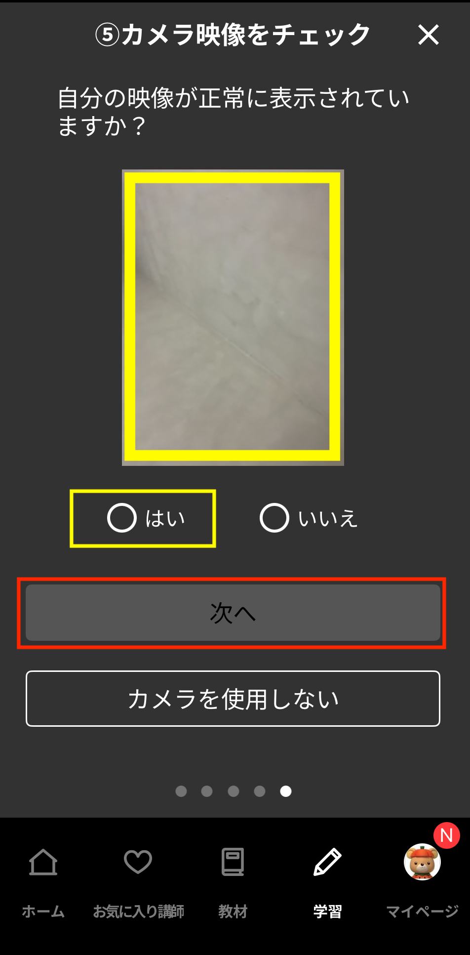 ネイティブキャンプの「レッスン環境チェック」から、カメラが正常に映るかを確認できます。