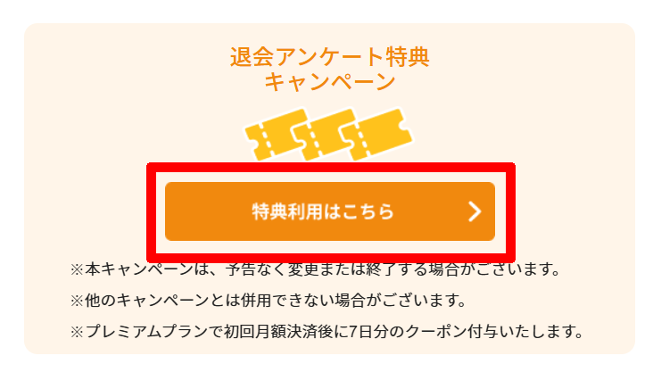 メール内の「退会アンケート特典 キャンペーン」というオレンジ色の見出しを探し、そのすぐ下にある「特典利用はこちら」ボタンをクリックします。