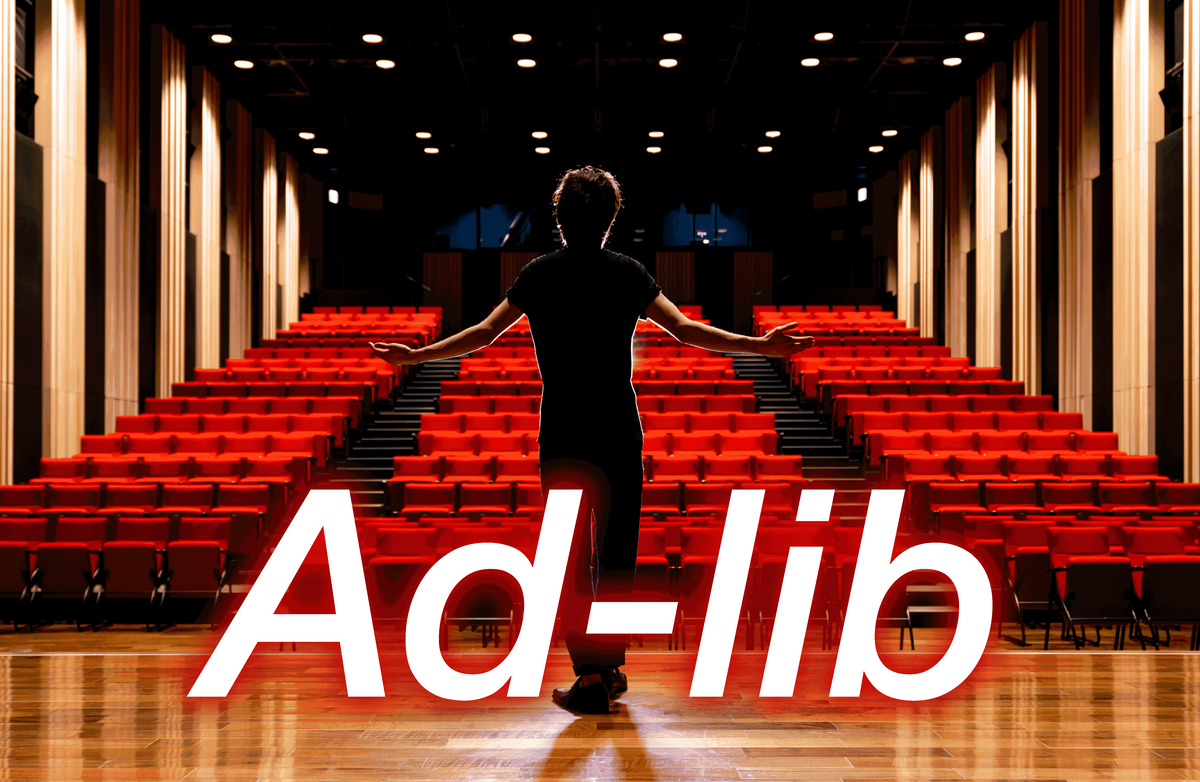 以下依序介紹一些可以表示即興的單字和片語用法。首先看的是Ad-lib,它來自於拉丁語的ad libitum,用來表達「隨意」的意思,屬於表演術語的一種。不過,它並不是一個英文中很頻繁出現的單字,請參考例句用法來一起了解。