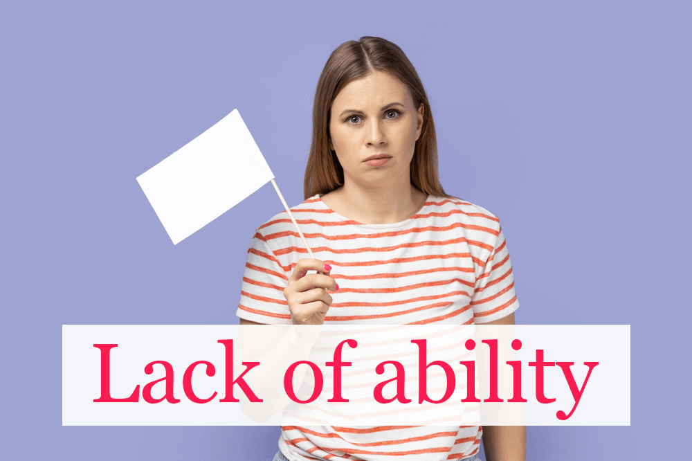 「Lack of ability」這個片語是由「lack(缺乏)」加上「ability(能力)」組合而成,是表達「能力不足」最基本也最常見的方式,不管在日常生活還是職場都能使用。