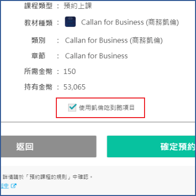 已使用凱倫吃到飽項目預約凱倫課程時,也可選擇花費金幣預約凱倫課程。